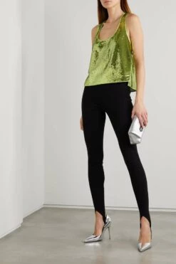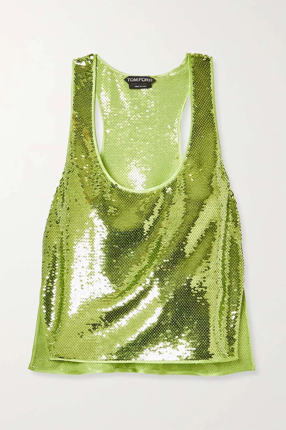 Why stop at embellishments when you can go big with color, too? Modeled on the Spring ’22 runway, TOM FORD’s lime-green tank is made from lightweight stretch-tulle covered with scores of liquid-like sequins. It’s trimmed with smooth silk at the neckline.