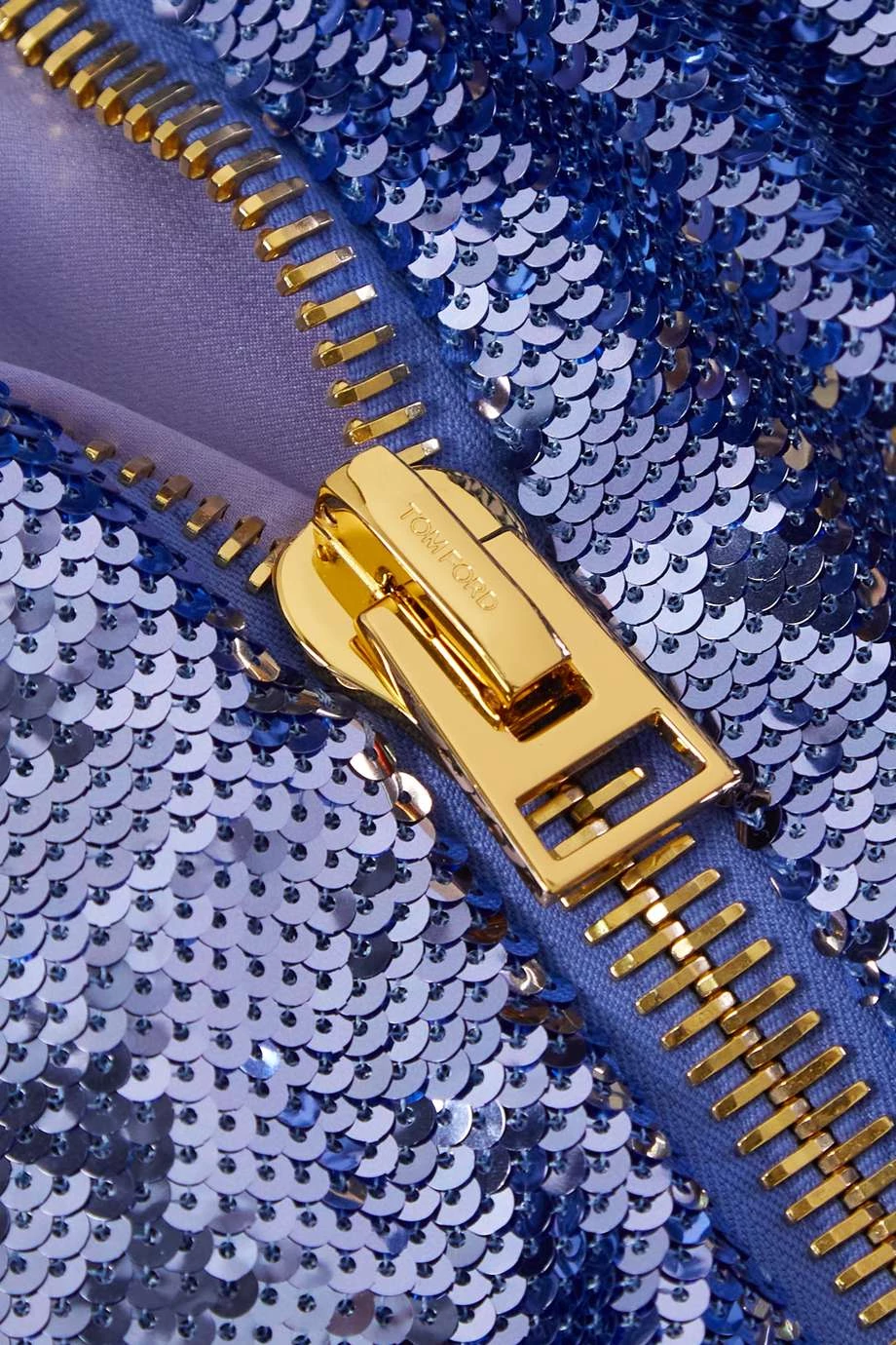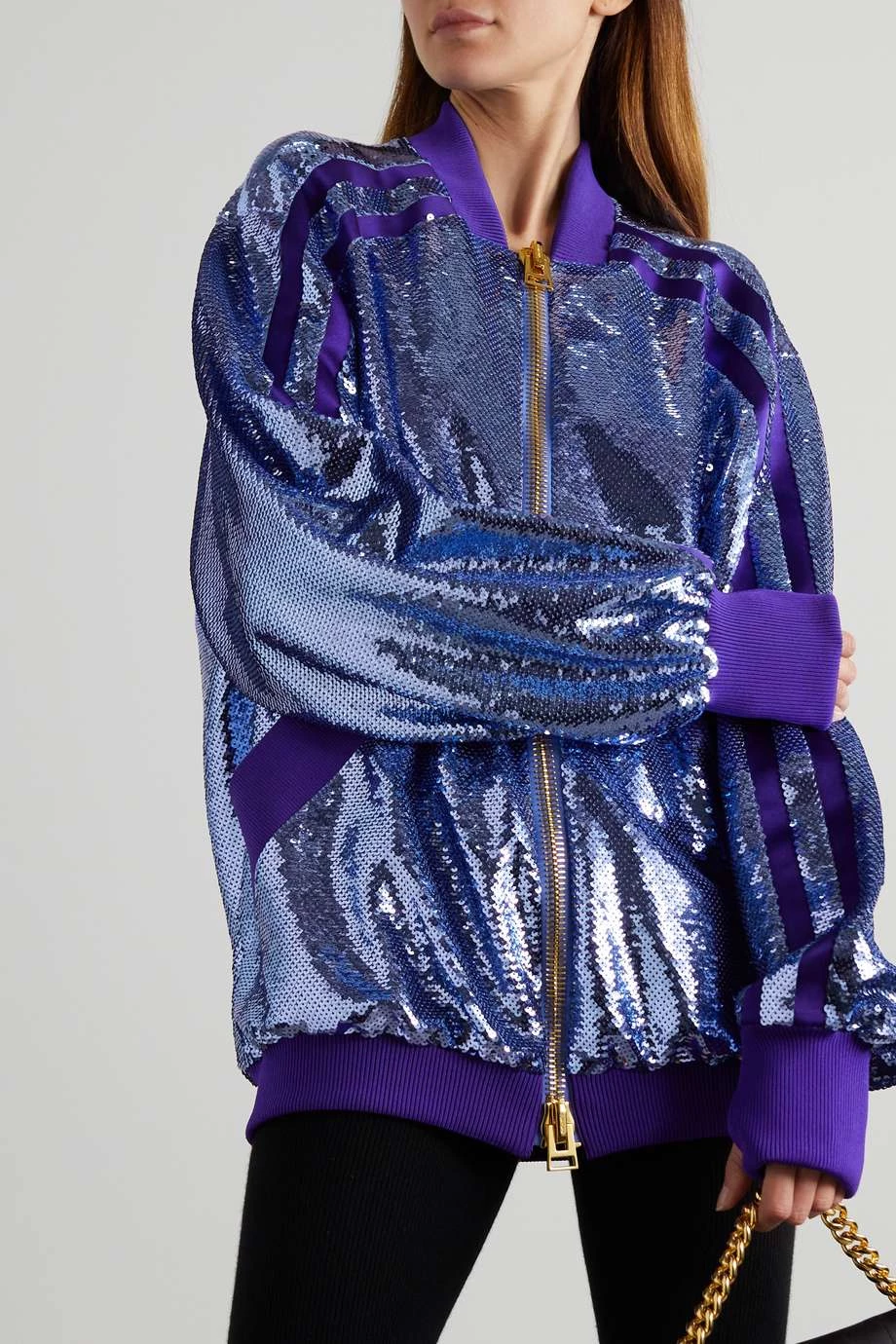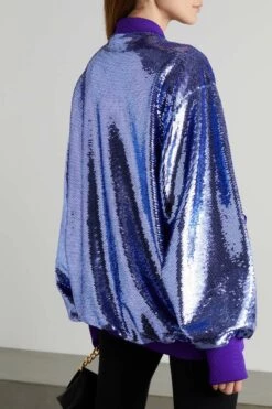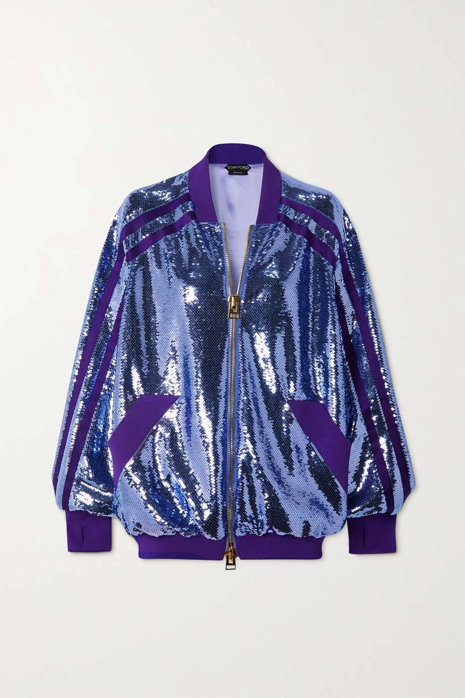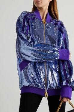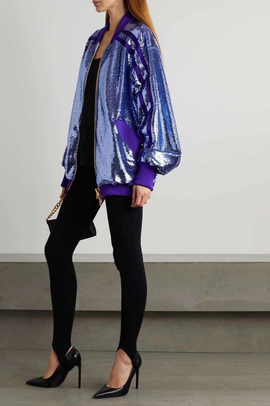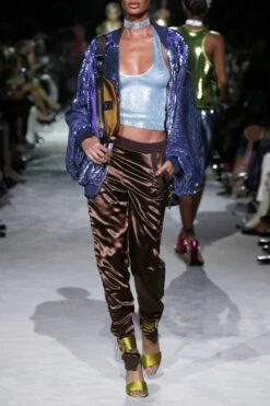 TOM FORD’s jacket is cut from purple satin and tulle with a beautiful drape and shimmering liquid sequins all over. It’s defined by contrasting stripes, cuffs and hem and was worn on the Spring ’22 runway with tailored pants.