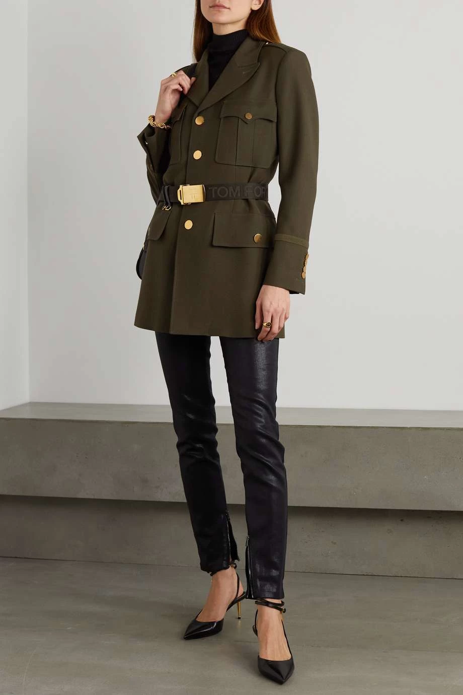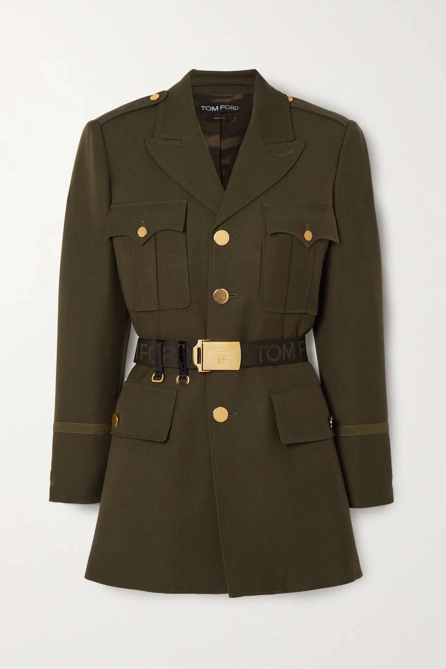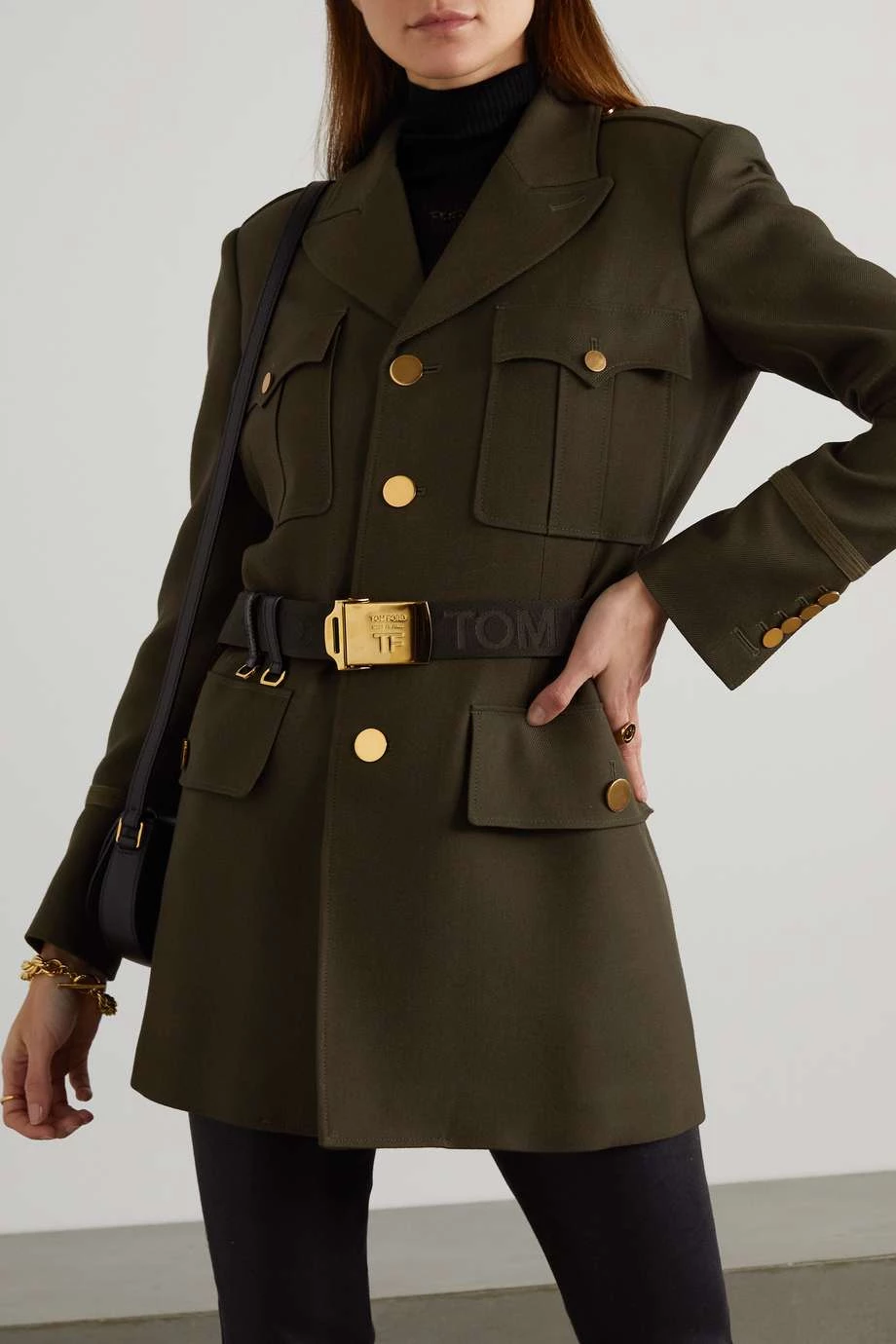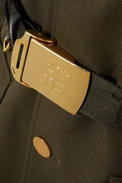 TOM FORD’s military-inspired jacket is tailored from wool-blend twill in a powerfully structured shape – look at the sharp shoulders and nipped-in waist. It’s detailed with gold buttons and a logo-woven belt for a glamorous, contemporary feel.