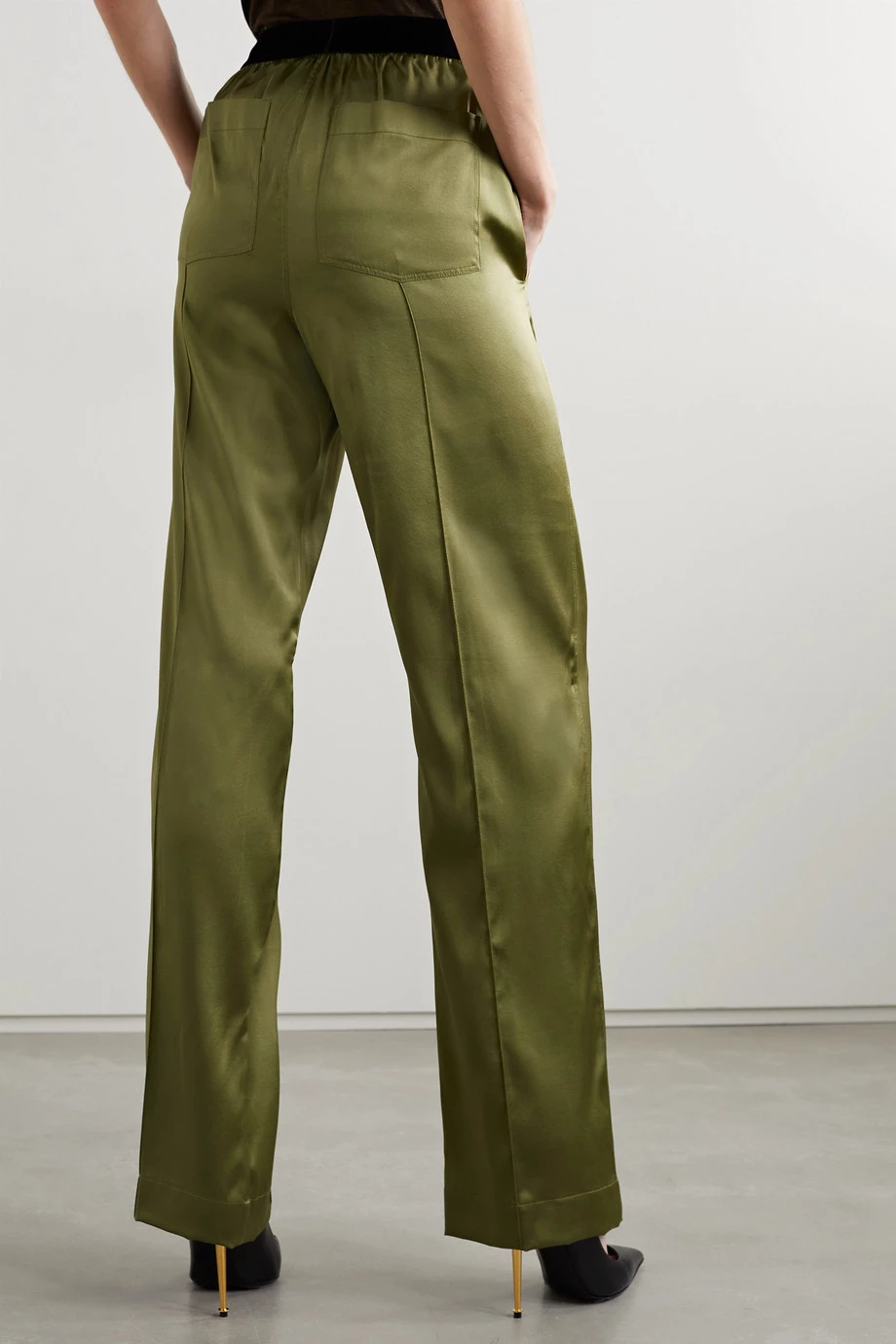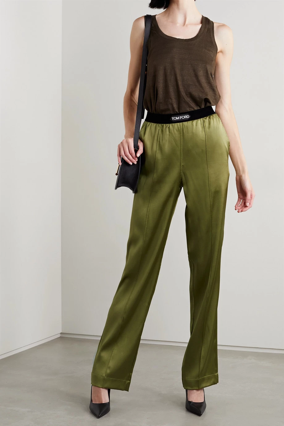 Expertly tailored in Italy, TOM FORD’s pajama-style pants are suitable for nice dinners and daytime looks alike. They’re made from lustrous silk-satin blended with stretch and have an elasticated, logo-detailed velvet waistband. Balance the relaxed legs with heeled sandals.