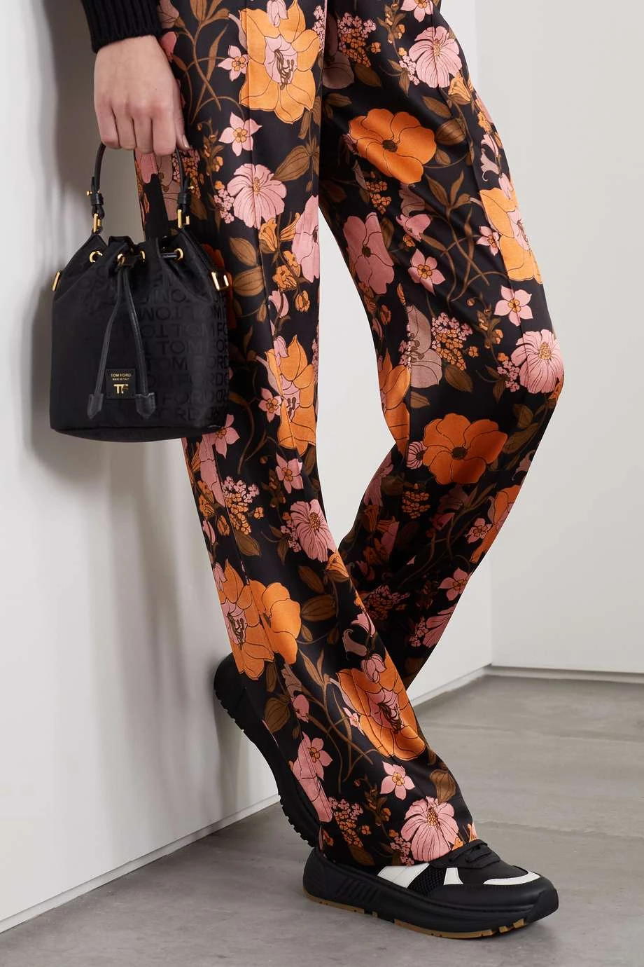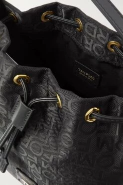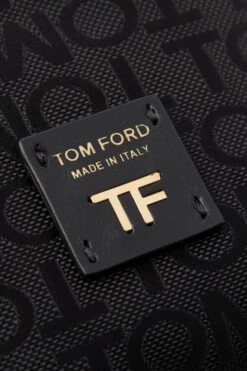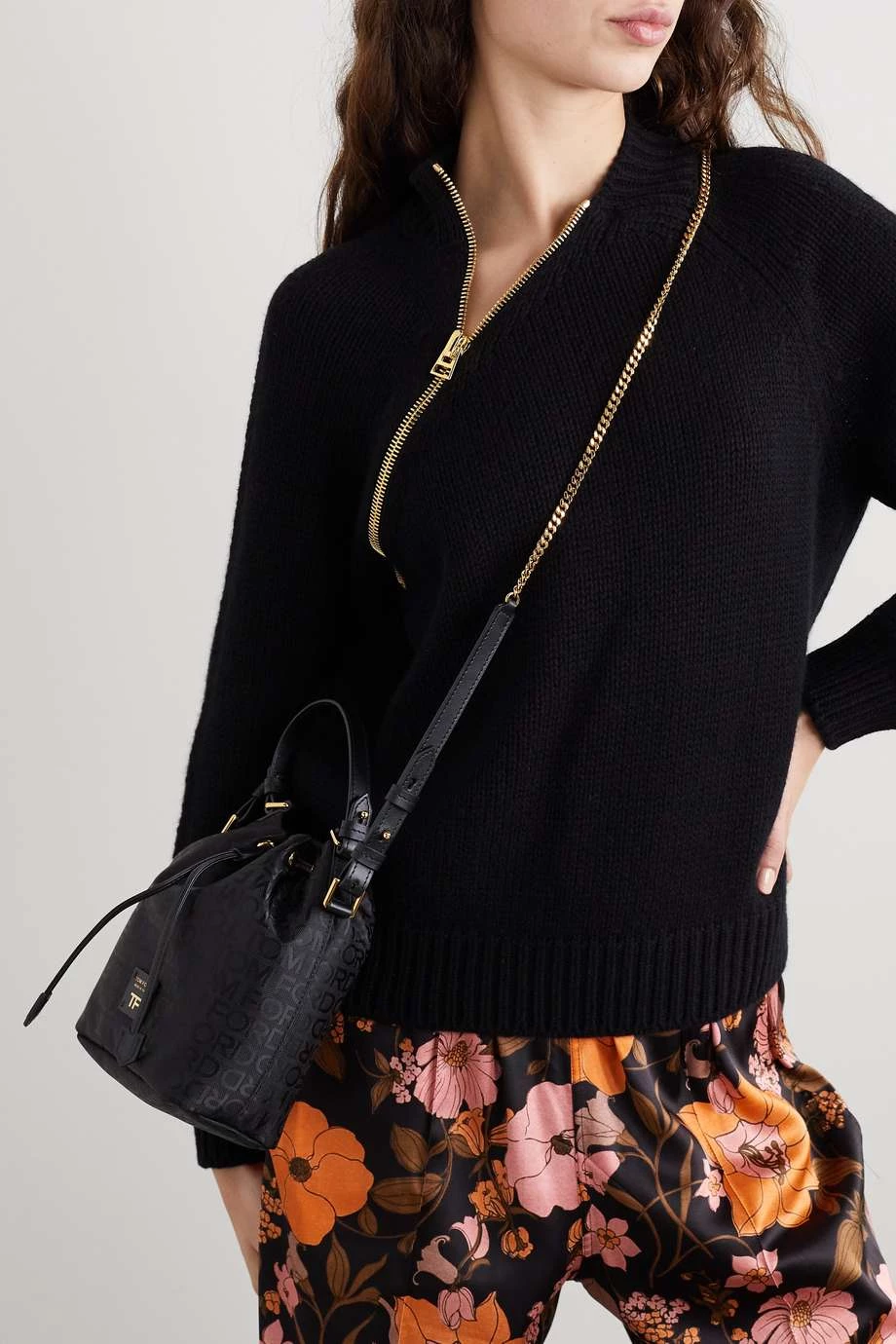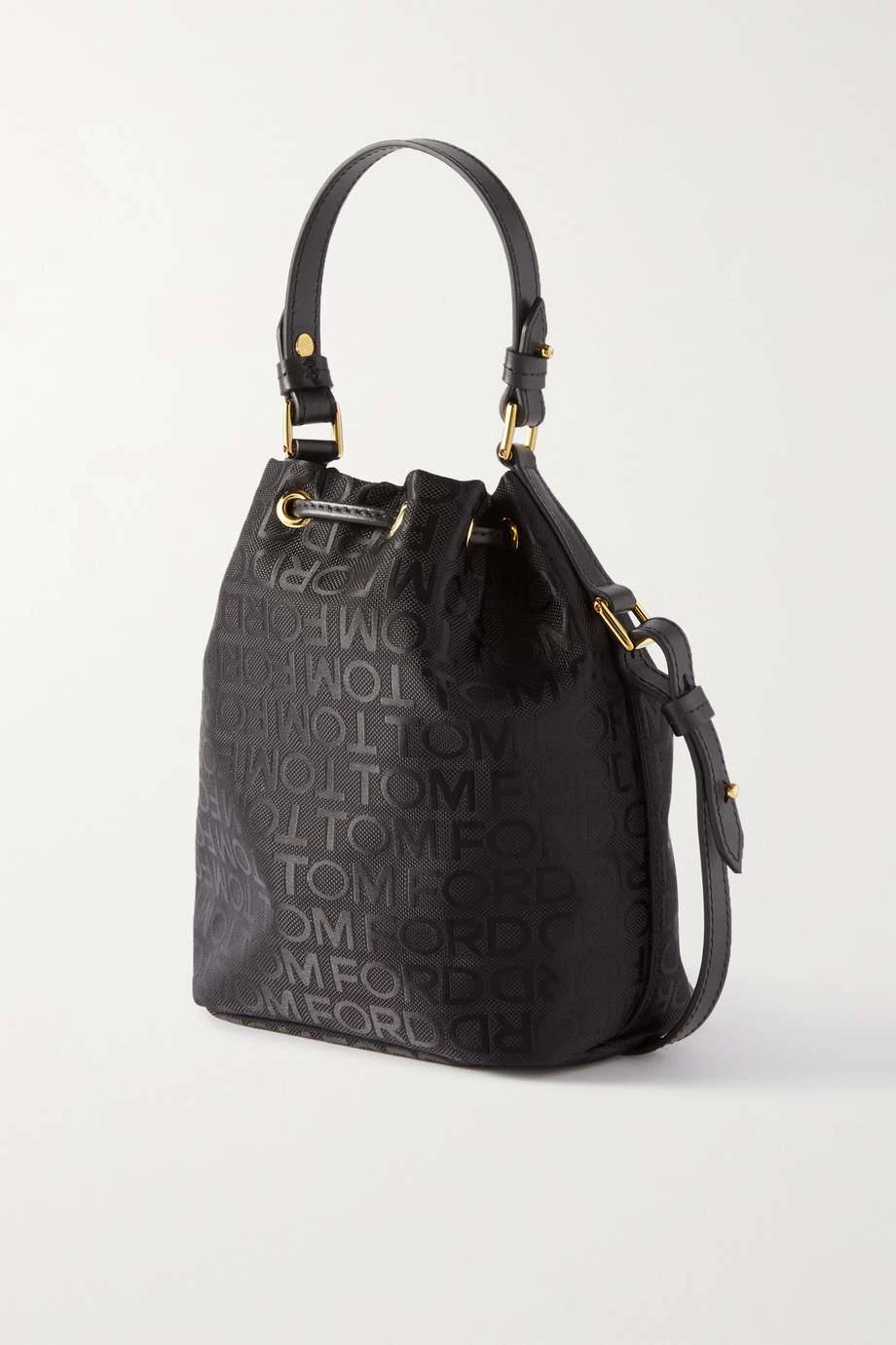 TOM FORD’s nylon bucket bag is jacquard-woven with the brand’s moniker for subtle detail and embellished with a gold-tone initial plaque at the base. Trimmed in tonal leather, it has a slim top handle and cross-body chain strap for when you want to go hands free. There’s enough room inside for everyday necessities.