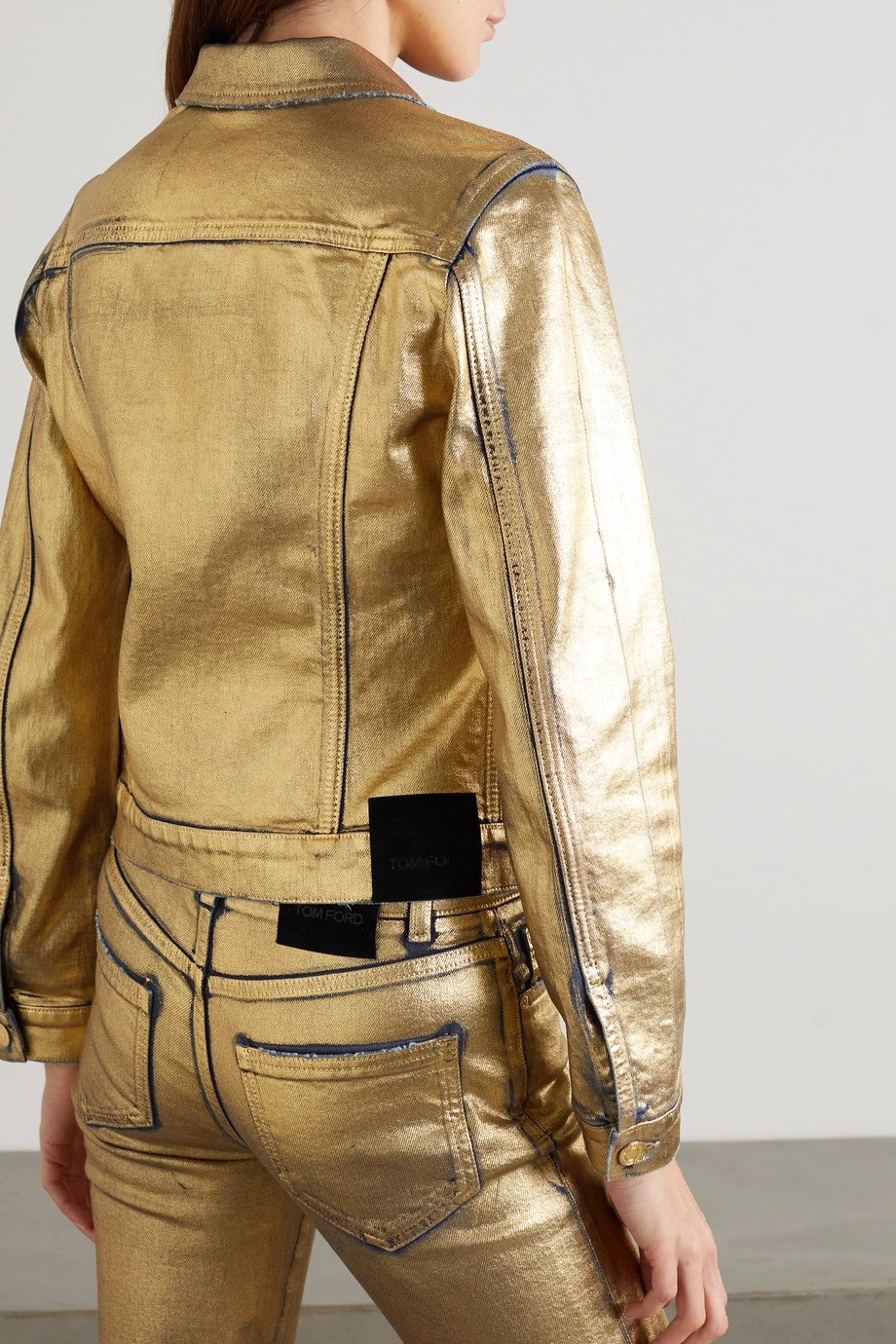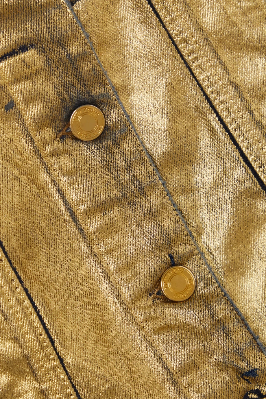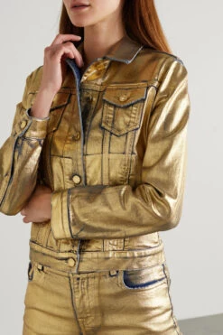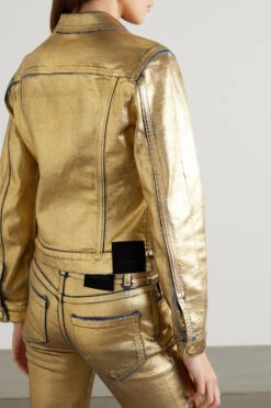 Metallics were a big deal at TOM FORD’s Spring ’22 show, and this denim jacket was one of the standouts on the runway. Coated in gold, it reveals a little of the blue fabric underneath. It has a slim, sculpted fit.