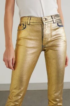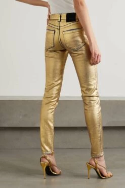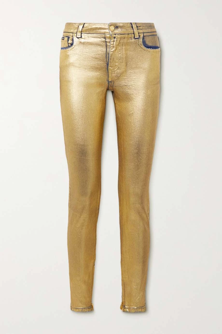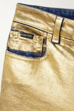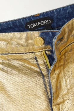 TOM FORD’s mid-rise jeans are coated with glittering gold – we love how the blue denim peeks through unexpectedly. They have a skinny fit and classic five-pocket design. Wear yours with the matching jacket from the Spring ’22 collection.