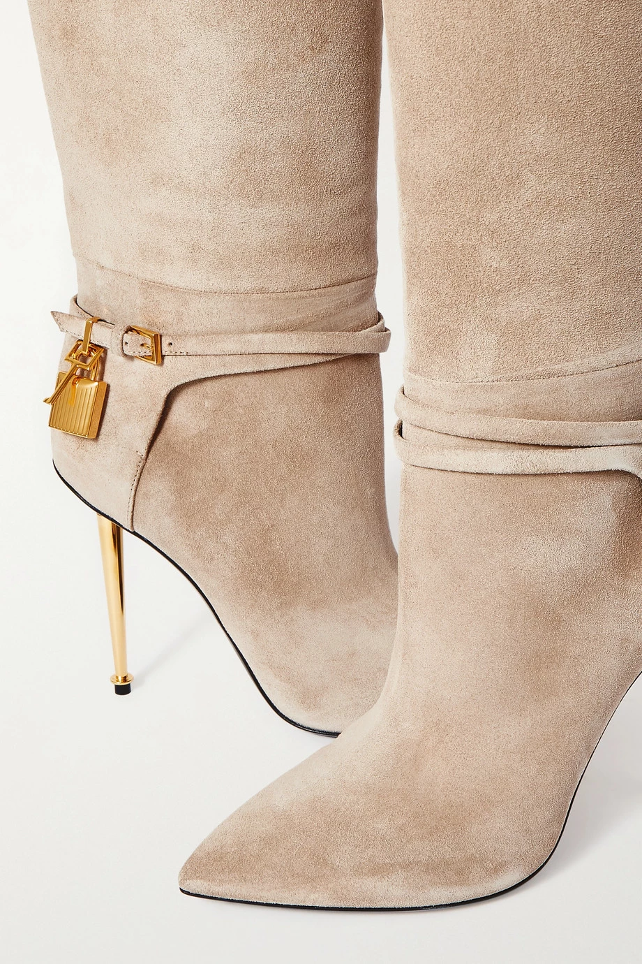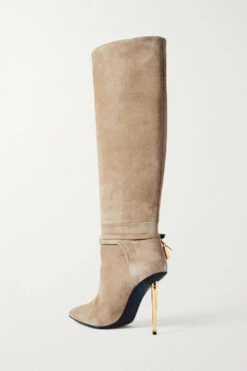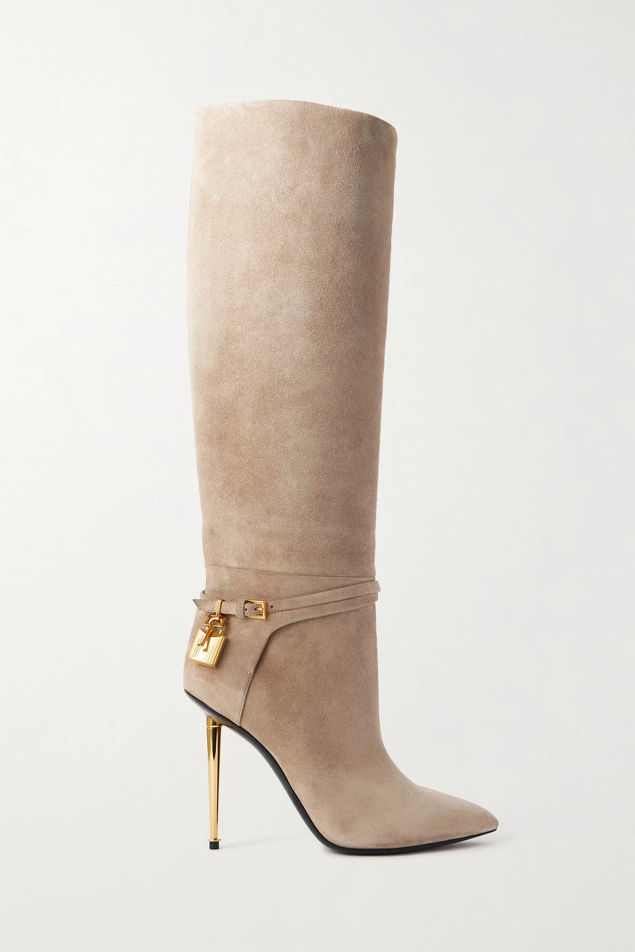 TOM FORD’s boots have a sharp point-toe stiletto silhouette that’s sleek and sultry. They’re made from suede and detailed with the brand’s signature gilded padlock attached to a strap that wraps around the ankle. Wear yours with a tonal sweater dress.