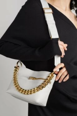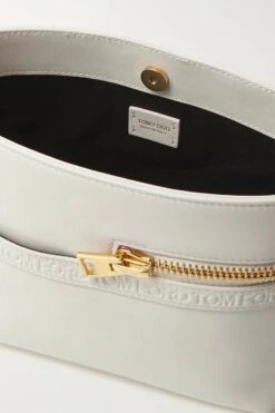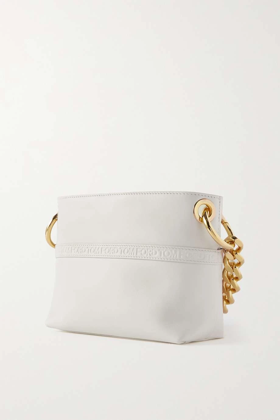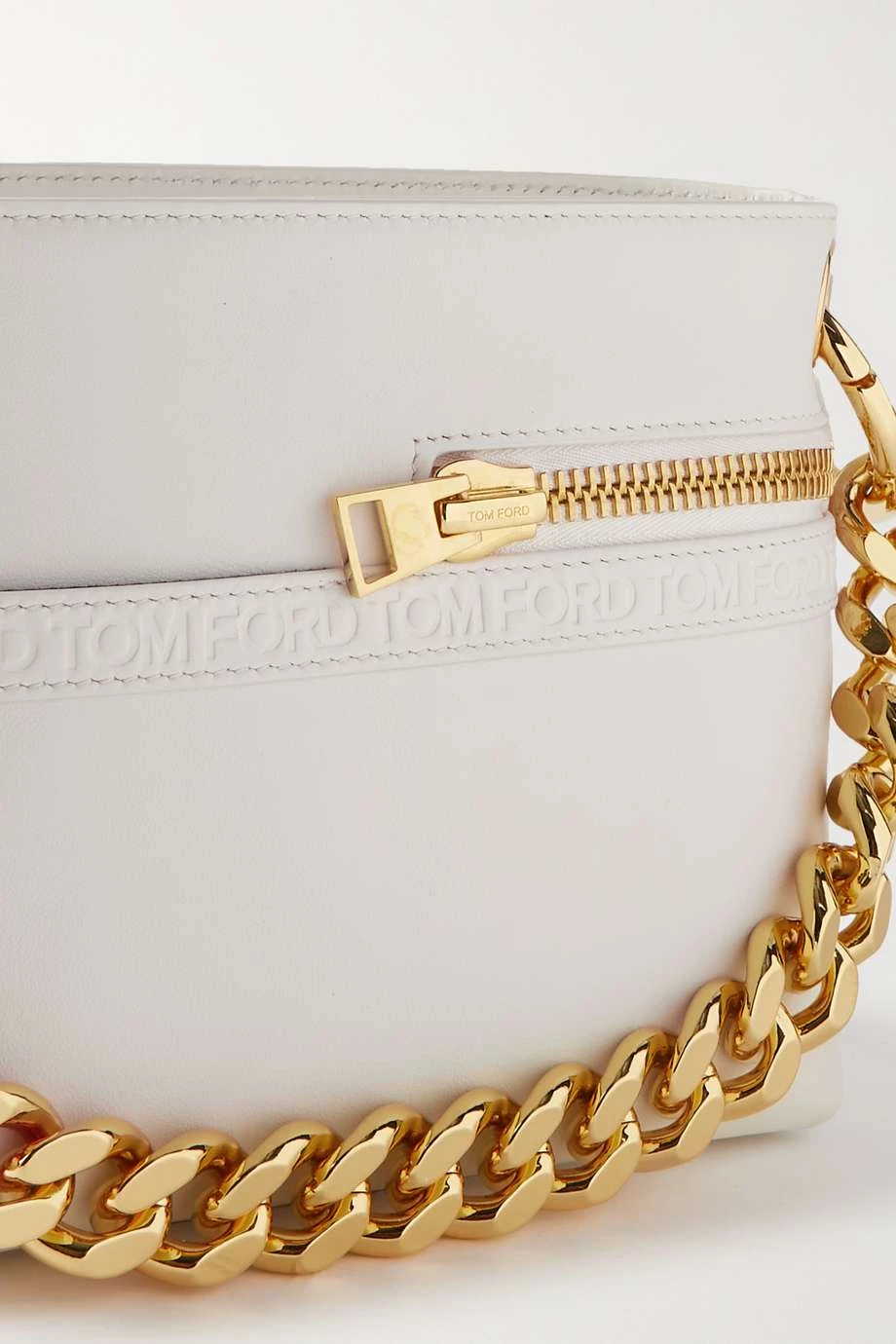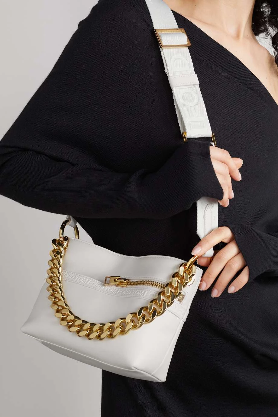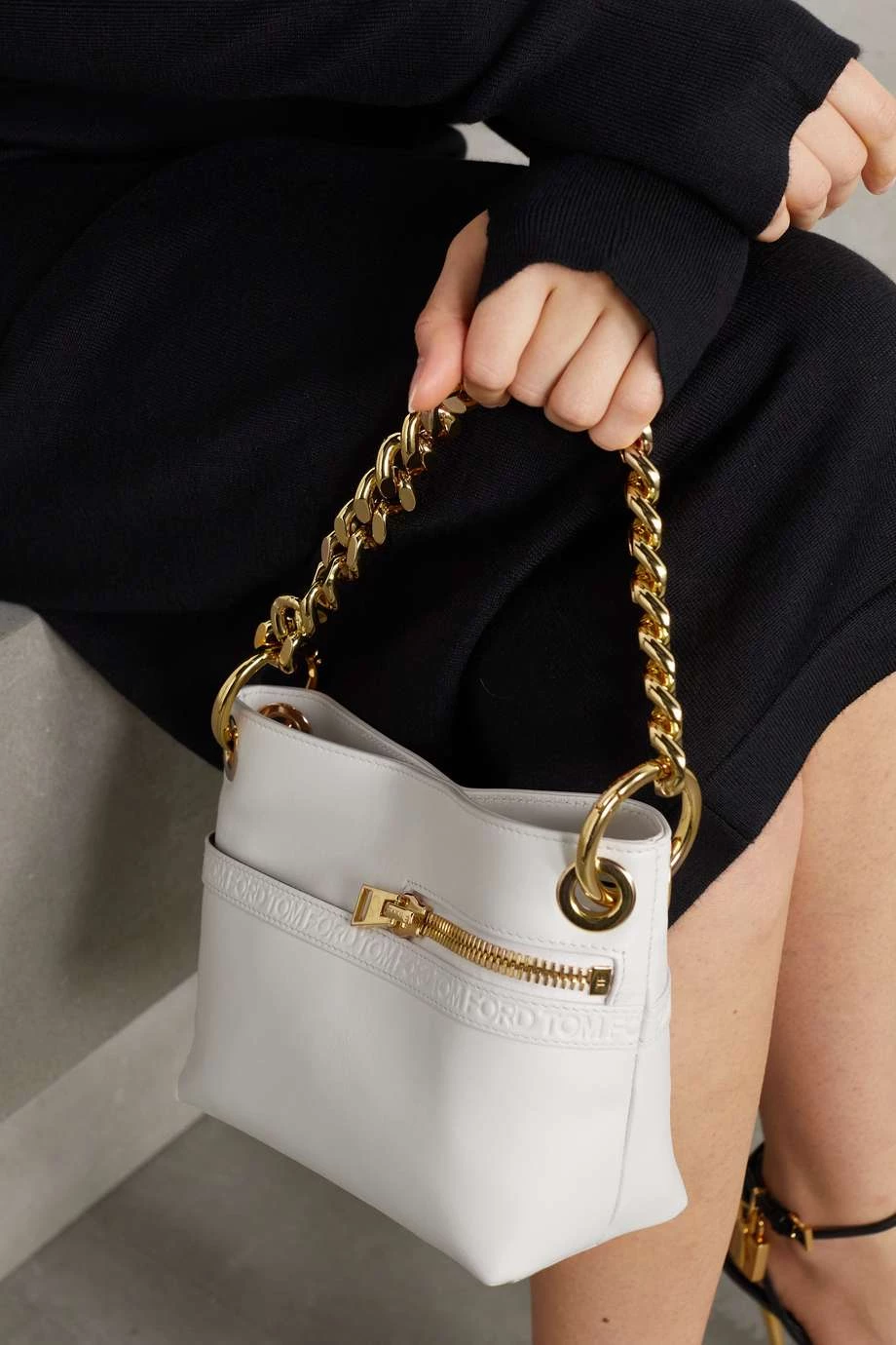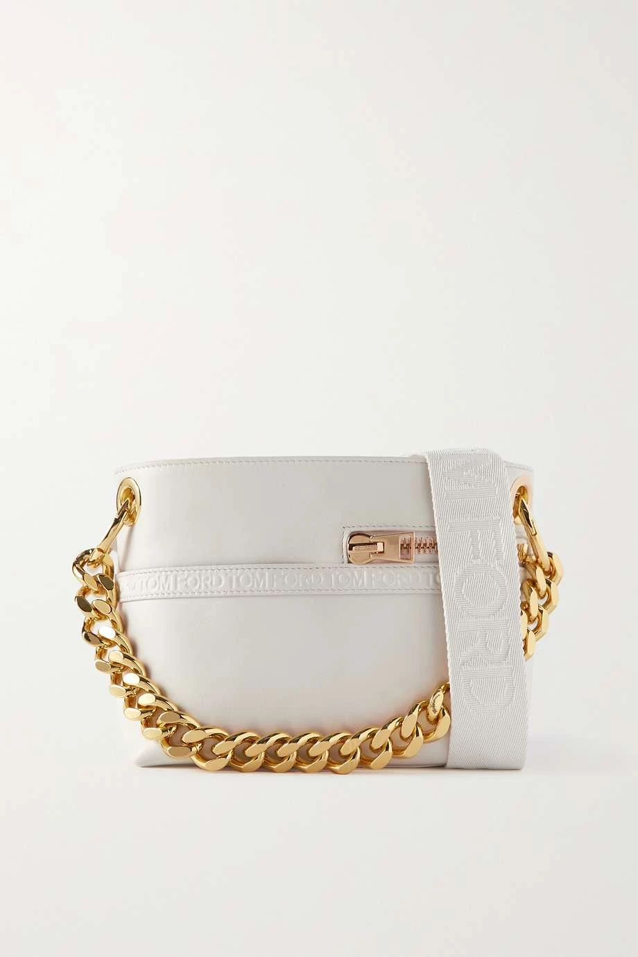TOM FORD’s shoulder bag has a chunky gold-tone top handle and detachable logo-jacquard strap that also allows you to wear it cross-body. It’s been made in Italy from supple white leather and has the brand’s logo debossed around the edge of the outer compartment.
