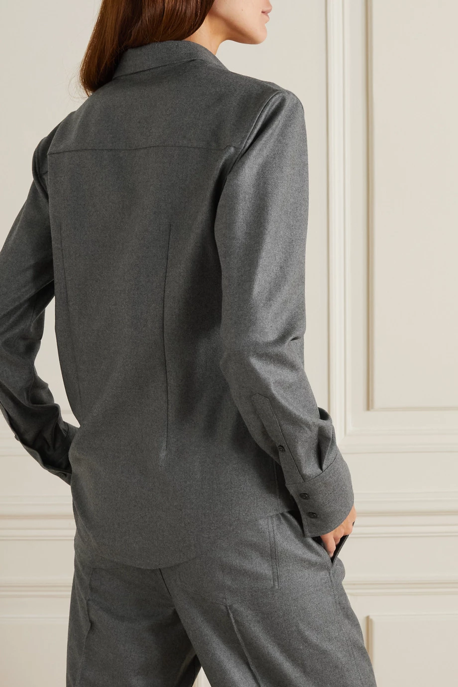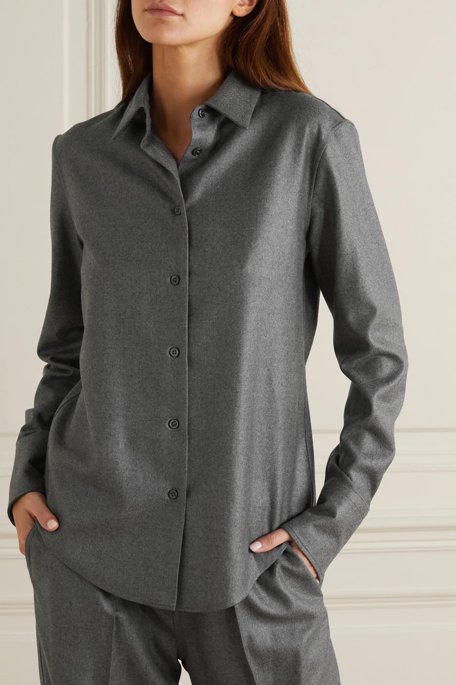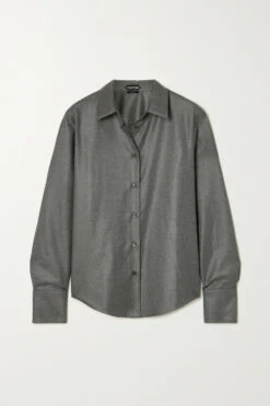TOM FORD’s shirt is cut from cashmere-twill chosen for its softness and warmth. It’s cut in classic silhouette with a sharp collar, structured cuffs and curved hem. Style yours with tonal pants and heels.