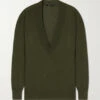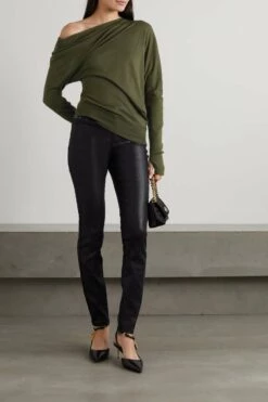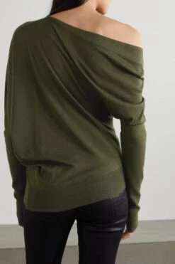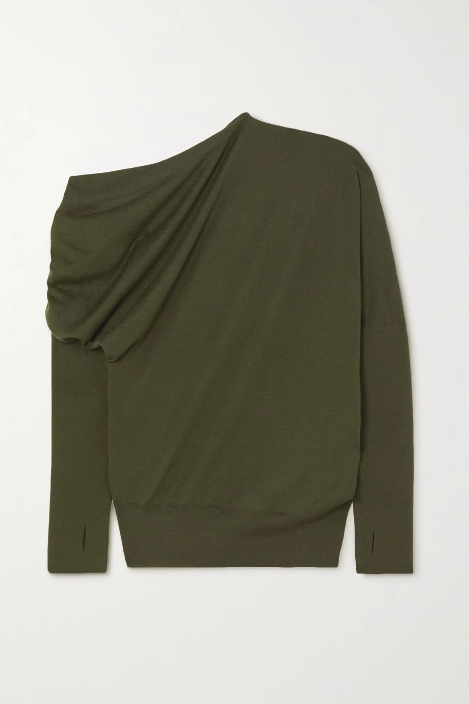 TOM FORD’s draped one-shoulder sweater is the perfect investment piece – it’s timeless, elegant and glamorous. Made in Italy, it’s finely knitted from a blend of army-green cashmere and silk for added softness. The thumbholes keep the sleeves in place.