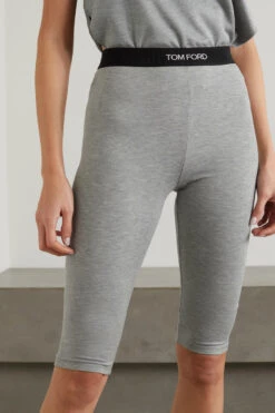 TOM FORD’s sporty, stretchy shorts are made from tactile stretch-modal jersey in dove gray mélange hues. They have a signature logo-jacquard waistband that calls back to the brand’s lingerie. Style yours with a loose tee at home and layered over a tailored jacket when you go out.